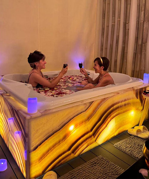 Sumérgete en nuestro ritual de baño con pétalos y hierbas sagradas, logrando así un balance de energías, generando la atmósfera perfecta para ti y tu pareja vibrando con música ancestral. Acompañado por frutas de temporada y jugo fresco o tabla de carnes frías con vino tinto. Sus terapeutas los esperan para acompañarlos a la cabina y seguirlos consintiendo con un masaje y facial hidratante.